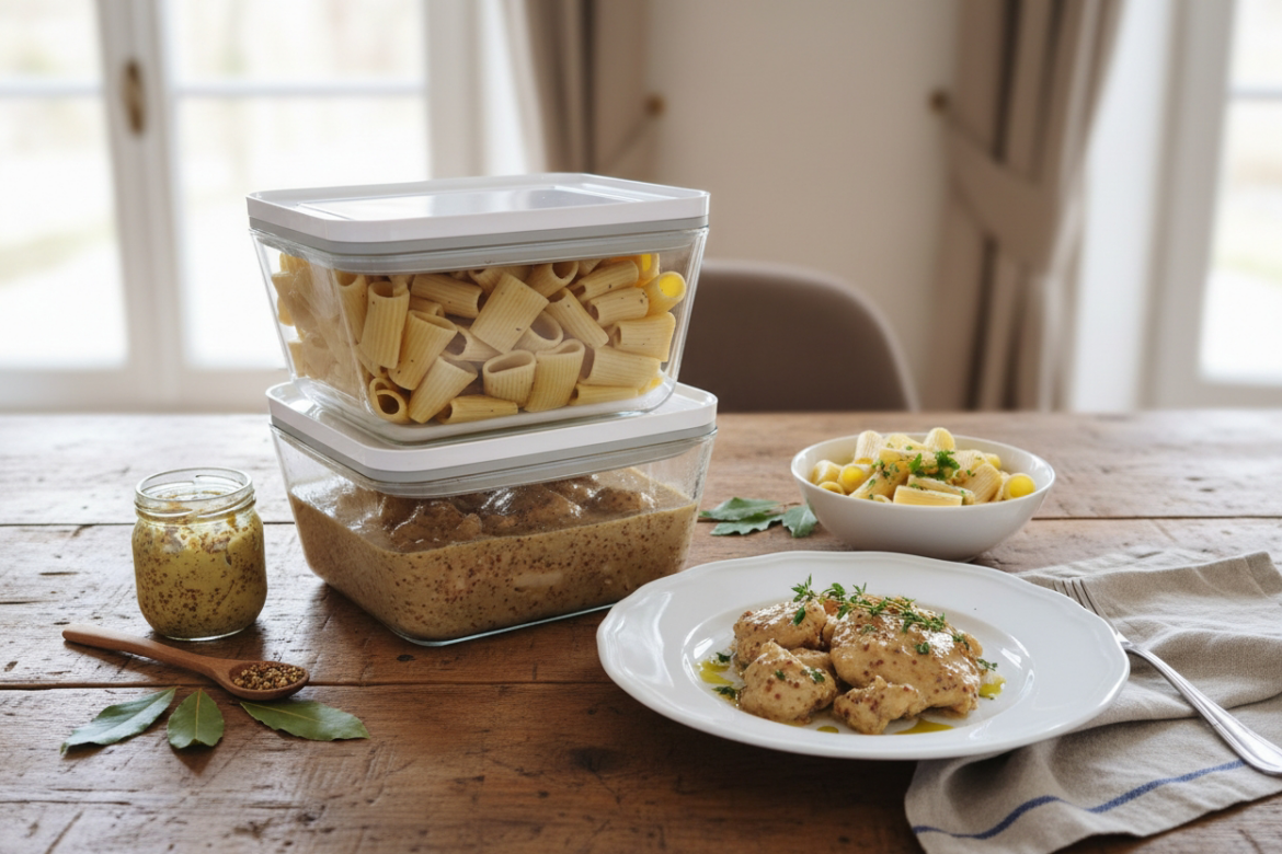 - ServiceSerre immédiatement, idéalement avec :des pâtes (comme tu l’as fait),du riz,ou une purée maison.La sauce nappe parfaitement, le poulet reste tendre, et la moutarde apporte un parfum rustique délicieux.