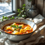 • Versez le bouillon chaud, portez à ébullition, puis laissez mijoter à feu doux pendant 25 minutes, jusqu’à ce que le potiron soit tendre comme les souvenirs d’enfance.